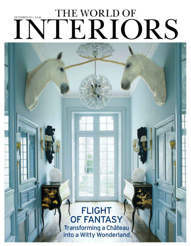 A capa desta revista mostrada em cima tem uma ideia peregrina espectacular: um hall de entrada com duas cabeças de unicórnios em paredes opostas, com suas hastes cruzadas junto ao tecto, como se de esgrimistas se tratassem.